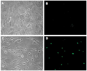 Following treatment with epinephrine (4×10 7 – 8×10 7 pg/ml), RPE cells underwent apoptosis, as evidenced by development of characteristic morphologic changes (condensation of the nucleus and cytoplasm; compaction and margination of chromatin) (Figure 1C) and positive TUNEL staining (Figure 1D). Apoptosis was induced in a dose- and time-dependent manner (Figure 2). Exposure to lower concentrations of epinephrine (10 2 – 2×10 7 pg/ml) for up to 7 days did not result in apoptosis.