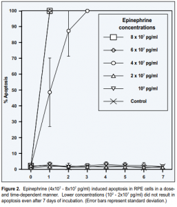 Using a monkey model of epinephrine-induced CSCR, Yoshioka and Katsume 13 have demonstrated degeneration of the RPE underlying areas of CSCR. Our finding that epinephrine can induce apoptosis in RPE cells may help substantiate this mechanism of degeneration and may contribute to the explanation of the pathogenesis of CSCR. It has previously been shown that stimulation of betaadrenergic receptors in RPE cells in vitro causes a net increase in cyclic adenosine 3′, 5′-monophosphate (cAMP) levels. 30 It has also been demonstrated that agents that elevate cAMP levels (i.e., epinephrine) can induce apoptosis. 31 These findings suggest that apoptosis in RPE cells may be induced by a beta-adrenergic/cAMP-mediated process. Clinical observations suggest that systemic administration of beta-blockers to patients with CSCR may improve vision and hinder recurrence of CSCR. 32 If RPE cell apoptosis indeed occurs in CSCR, these observations further support the hypothesis that it is mediated by a beta-adrenergic mechanism. Another possible mechanism by which apoptosis could be induced may involve oxidative byproducts of epinephrine. Epinephrine is metabolized by monoamine oxidase (MAO) into 3,4-dihydroxyphenylglycolaldehyde (DOPEGAL) and hydrogen peroxide, 33 both of which could act as inducers of apoptosis. 33,34,35 Experimental evidence suggests that MAO is present in RPE cells. 36 RPE cells could therefore metabolize epinephrine and undergo apoptosis in response to its metabolites. Drug doses used in toxicity studies include high, intermediate and low levels of a test compound. High doses allow one to observe toxic effects more readily. 37 In the current study, epinephrine levels at which apoptosis was observed were 8 x 10 4 to 1.6 x 10 6 times higher than endogenous in vivo levels. Since apoptosis could be difficult to detect due to its rapid kinetics and the relative paucity of cells that undergo apoptosis at any specific time point, 38 the administration of such high drug doses could facilitate observation of this process. Further toxicokinetic studies would however be necessary to determine how these high-dose acute findings correlate with the in vivo situation where prolonged exposure to lower drug levels is present. 37 Dexamethasone did not induce apoptosis at any of the tested concentrations. However, corticosteroids may cause an upregulation of adrenergic response by increasing the number of adrenergic receptors and/or increasing the responsiveness of each receptor. 39 A corticosteroidinduced increase in adrenergic response could possibly result in a cAMP-mediated apoptotic response similar to that observed in epinephrine-treated cells, and could also account for CSCR observed following treatment with corticosteroids. Such responses however could not be evaluated in these studies since no adrenergic agents were present in the cell cultures treated with dexamethasone. Although the pathophysiology of CSCR is poorly understood, various theories regarding its pathogenesis have been proposed. Spitznas 14 hypothesized that it is due to a cAMP-mediated reversal of the RPE fluid pumping action. According to this model, fluid is pumped in a chorioretinal, instead of a retinochoroidal direction. This leads to accumulation of fluid in the subretinal space. Initially, the fluid movement occurs transcellularly. However, the diffusion barrier (i.e., RPE) eventually breaks down, leading to direct leakage of fluid into the subretinal space. Although Spitznas proposed that the disruption of the barrier is due to strong fluid flow, it could also be due to degeneration of the RPE. Applying our findings to this model, the increase in cAMP could account not only for the reversal of the pumping action, but also for the breakdown of the diffusion barrier.