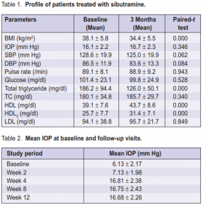 Thirty obese females (mean age 38.1 ± 5.8, BMI >30 kg/m2 ) were treated with sibutramine (10 mg/day) plus diet restriction for 3 months. Patients with obesity of endocrine origin or who had a history of treatment for hypertension, systolic blood pressure (SBP) ≥160 mm Hg, diastolic blood pressure (DBP) ≥95 mm Hg in the seated position with concomitant heart rate ≥100 beats/minute, and type 1 and type 2 diabetes mellitus were excluded. Assessments were made at baseline and weeks 2, 4, 8, and 12 after administration of sibutramine. At each visit, the investigators recorded the patient’s weight to the nearest 0.5 kg with the patient wearing indoor clothing and no shoes. SBP, DBP, pulse rate, IOP, and adverse events were also recorded. BMI was computed as weight in kilograms divided by the square of height in meters. IOP was measured in right eyes between 9:00 and 10:00 AM with a Goldmann applanation tonometer. The mean value of the three IOP measurements was used for analysis. Full ophthalmological examination was performed: slit-lamp biomi c ros copy, fundus copy, and ocul a r ref r a c t ion. Subjects with glaucoma, IOP ≥22 mm Hg, cup–disc ratio of 0.4 or higher, refractive error >±4 D, or any other type of ocular disease or disorder were excluded. Laboratory investigations (complete blood count, serum glucose, uric acid, creatinine, hepatic enzyme, total cholesterol (TC), triglyceride, low-density lipoprotein (LDL), high-density lipoprotein (HDL), and HDL levels were repeated at baseline and at months 1 and 3. Results were evaluated statistically by paired t-test, analysis of variance (ANOVA), and least-significant difference (LSD) test.