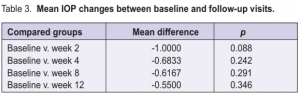 but there were no statistically significant differences by ANOVA (p = 0.54) during the follow-up visits. LSD test showed no significant differences in the mean IOP between visits (Table 3).