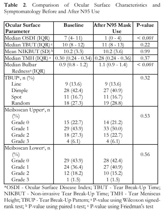 Among all the parameters used to evaluate the ocular surface, bulbar conjunctival redness was the only one seen to have a significant change after wearing an N95 mask. Other factors could have caused the increased bulbar conjunctival redness. For instance, eye redness secondary to eye strain from prolonged use can be one of the possible causes. Exposure to irritants, such as dust and wind, can also be a possible etiology.