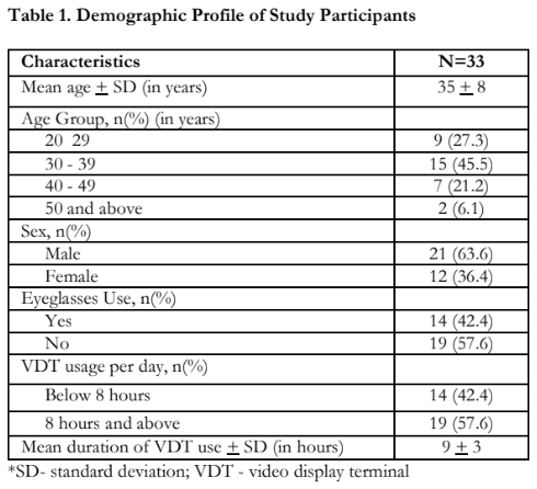 Thirty-three (33) HCWs were enrolled in the study. Table 1 shows the demographic profile of the study participants. The mean age was 35 + 8 years with the majority (45.5%) belonging to the 30-39 age group (n=15). There were 21 (63.6%) males and 12 (36.4%) females. Prescription eyeglasses were worn by 14 (42.4%) study participants. Mean VDT use was 9 + 3 hours and the majority (57.6% or n= 19) used VDT for at least 8 hours a day.