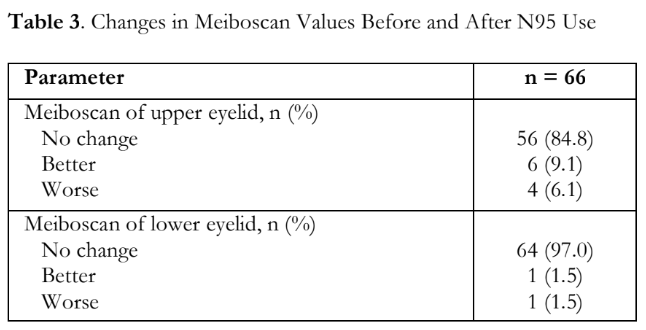 TBUP values were similar pre- and post-N95 use with dimple break (n = 28) and random break (n = 18) patterns representing most of the sample (p = 0.32). Meiboscan grading of the upper eyelids was also mostly grade 1 at both time points (n = 29 and 33, respectively) (p = 0.53). Similarly, Meiboscan grade distributions of the lower eyelids also had minimal change as majority were grade 0 at both time points (n = 29 and 28, respectively) (p=0.56). Table 3 shows that Meiboscan values were mostly unchanged for both upper and lower eyelids.