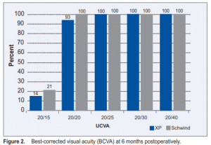 Thirty-two eyes of 16 patients were included in the study. Six were male and 13 female, with a mean age of 34 ± 9.3 years (range, 21 to 48 ). The preoperative UCVA, spherical equivalent, and central pachymetry were similar in both groups (Table 1). Flap thickness and complications The mean flap thickness created was 97 ± 13 µm (range, 81 to 116 µ) using the CP and 146 ± 27 µm (range, 71 to 181 µm) using the XP. The mean deviation from the predicted thickness was –13 ± 13 µm and 26 ± 27 µm for the CP and XP respectively. The difference between the groups was statistically significant (p = 0.002). In the CP group, 3 eyes had flap displacement, 1 had loose epithelium and 1 had flap striae. There were no complications in the XP group. No evidence of ectasia was noted in all eyes. Visual results At 6 months postoperatively, UCVA was 20/20 in 93% and 86% of eyes in the CP and XP groups respectively. Mean UCVA was 20/20 (range, 20/15 to 20/20) in the CP and 20/25 (range, 20/15 to 20/30) in the XP groups. UCVA was 20/30 or better in all eyes in the 2 groups (Figure 1). The BCVA was 20/20 in 100% and 93% of eyes in the CP and XP groups respectively. Mean BCVA was 20/20 in both groups (range, 20/15 to 20/20). All eyes achieved BCVA of 20/25 (Figure 2). There was no statistical difference in the UCVA and BCVA in either group (p = 0.27 for CP and p = 0.16 for XP). Preoperatively, the mean spherical equivalent was –4.50D and –4.70 in the CP and XP. The mean sphere was –4.00D in both groups. The mean cylinder was –0.9 and –0.8