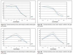 respectively (Table 2). At 6 months postoperatively, the mean spherical equivalent was –0.04D in the CP and –0.1 in the XP groups. The mean sphere was –0.02D and 0.03 and the mean cylinder was –0.1 and –0.27 respectively (Table 2). At 6 months, contrast sensitivity both at photopic and mesopic conditions, with and without glare, were all measured at 1.5, 3, 6, 12, and 18 cycles/degree (cpd) (Figures 3 and 4). Contrast sensitivity was better in the
