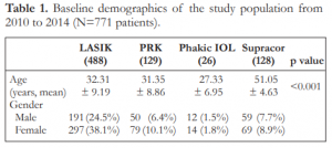 This study evaluated 1,366 eyes of 771 patients who underwent various refractive procedures. 59.5% of the participants were females. LASIK, PRK, and phakic IOL belonged to similar age groups with mean ages of 32.31, 31.35, and 27.33 years, respectively, while the Supracor group was older with mean age of 51.05 years (Table1).