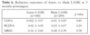 Table 6. Refractive outcomes of femto vs. blade LASIK at 3 months postsurgery.