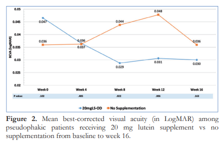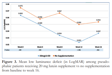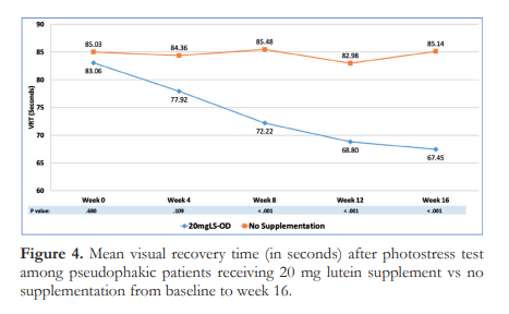 Our study shows that lutein supplementation significantly reduced VRT beginning at week 8 and sustained up to week 16. Of note, both groups showed higher than normal VRT values across all time points which can be attributed to the use of brighter and whiter LED bulbs during photostress test. In addition, removal of the crystalline lens, a natural filter of the eye, may dazzle patients for longer period of time.
