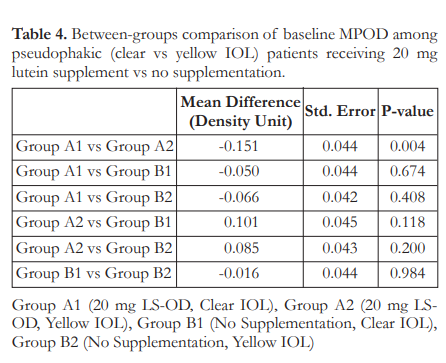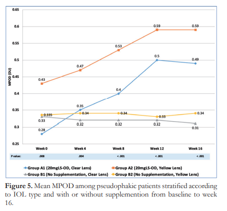 It should be noted that when the supplementation and non-supplementation groups were subdivided further by the type of IOL (yellow versus clear), the four groups differed from one another, both at week 0 and at the end of the study. However, significance was seen only between Group A1 (lutein supplemented, clear IOL) and Group A2 (lutein supplemented, yellow IOL). The yellow IOL could be superior in conferring protection to the macula by providing the first degree of barrier and filtering blue light that may exhaust macular pigments. In this study, the yellow IOL had inherent protection to blue light and the lutein supplementation enhanced it further by increasing MPOD and macular function. Overall, it can be concluded that while yellow IOL provide macular protection, the addition of 20 mg lutein supplement once daily exhibits linear, direct, and high-level MPOD elevation that plateaus when supplementation is discontinued.