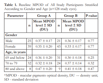 At baseline, the mean MPOD level of all study eyes was 0.35 ± 0.18 density units (DU). The MPOD levels by gender and age groups are shown in Table 1.