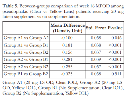 Tukey’s post-hoc analysis of baseline mean MPOD was carried out for pairwise comparisons among the four subgroups. At baseline, only Groups A1 and A2, with mean MPOD of 0.28 and 0.43 DU respectively, showed signficanct difference; with Group A2 having the highest mean MPOD (Table 4). At week 16, all comparisons showed a significant difference (Table 5) except those between Group B1 and Group B2 (p=0.911).