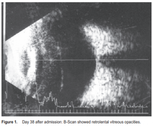 final visual acuity and media clarity.10 It also found that pars plana vitrectomy was beneficial only in patients who present with vision of “perception to light” only.10 Omission of intravenous antibiotics and performing pars plana vitrectomy only in patients presenting with vision of “perception to light” offer considerably savings in treatment cost without affecting final visual outcome.25 This patient was diagnosed with acute bacterial postcataract-surgery endophthalmitis and managed according to the EVS guidelines. He was treated with repeated intravitreal vancomycin and ceftazidime and intensive topical vancomycin and ceftazidime. No pars plana vitrectomy was performed and no intravenous antibiotics were given. The final visual outcome was 6/18. Figure 1. Day 38 after admission: B-Scan showed retrolental vitreous opacities.