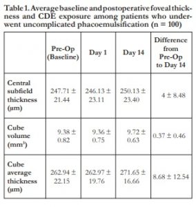 Even though postoperative increase in foveal thickness may be minimal and clinically asymptomatic, it represents a key occurrence which may lead to formation of CME. Taking into account the increasingly large number of patients undergoing phacoemulsi cation surgery, despite the fact that clinically signi cant CME is rare, it is critical for us to comprehend the mechanisms and postoperative changes in the macular region in relation to cataract surgery. Further studies are needed to investigate a possible relation between CDE and foveal thickness.