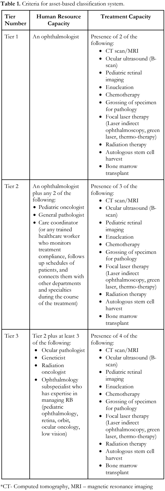 To better qualify treatment capacity, an asset- based tier classification of hospitals was created based on the availability of human resources capacity and treatment capacity (Table 1). Tier 1 refers to hospitals that had the capacity to diagnose RB by an ophthalmologist. Tier 2 are hospitals that can manage advanced cases of RB by enucleation and intravenous chemotherapy administered by a pediatric oncologist. Tier 3 are hospitals capable of ocular salvage and treating the different stages of RB with subspecialized care and rehabilitation thereafter.