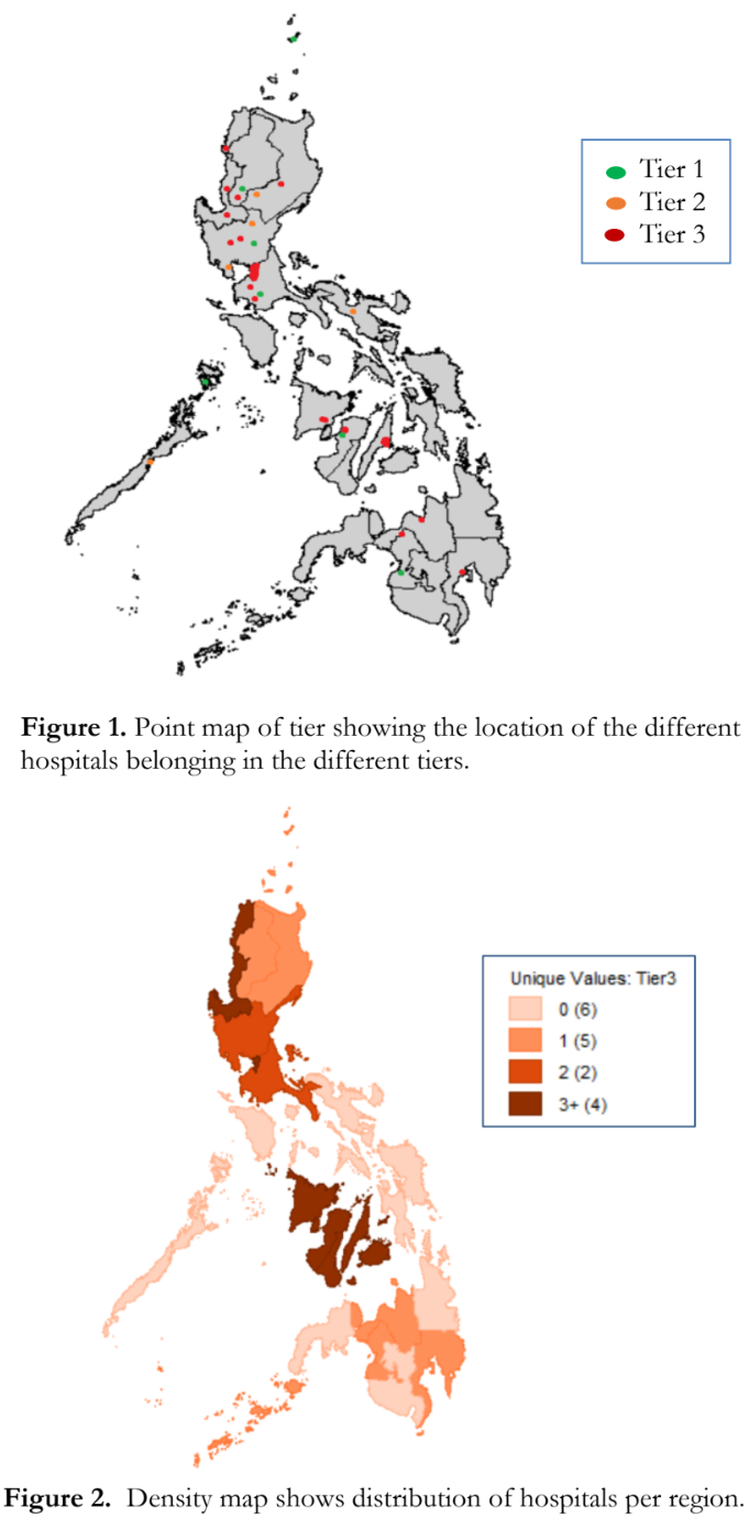 Figure 1 is a point map showing approximate locations of the hospitals color-coded by tier in the Philippines. Figure 2 is a density map which shows distribution of hospitals per region. Both maps show that majority of the hospitals are concentrated in Luzon.