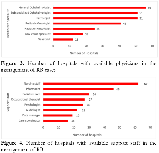 suited some physicians who are not adept with answering surveys through an online link or QR code. The first survey of this kind was published by Burges et al. that assessed the capacity to treat RB in the Eastern Mediterranean region.6 However, their survey was distributed to representatives from the Pediatric Oncology East and Mediterranean (POEM) group, naturally obtaining a 100% availability of pediatric oncologists. Our study included all hospitals under the DOH and all tertiary hospitals to avoid sampling bias. DOH hospitals are expected to complement other government-funded and private health facilities in delivering affordable and accessible quality health services. In 2020, the Global Retinoblastoma group published data from 278 RB treatment centers, where Asian countries represented 52% of the participants. They noted a 49% incidence of extraocular tumors at the time of diagnosis of RB patients from low-income countries versus a 2% incidence from high-income countries.9 Pediatric oncologists are more needed in delayed clinical presentations. In our study, 64% of the respondents reported the presence of a pediatric oncologist. The pediatric oncologist was one of the resources more available in the higher-tier hospitals. This maldistribution can affect a LMIC like the Philippines, where RB cases present in advanced stages requiring the care of a pediatric oncologist at the onset. The collaborative management between an ophthalmologist and a pediatric oncologist is critical in increasing the chances of survival of RB patients.