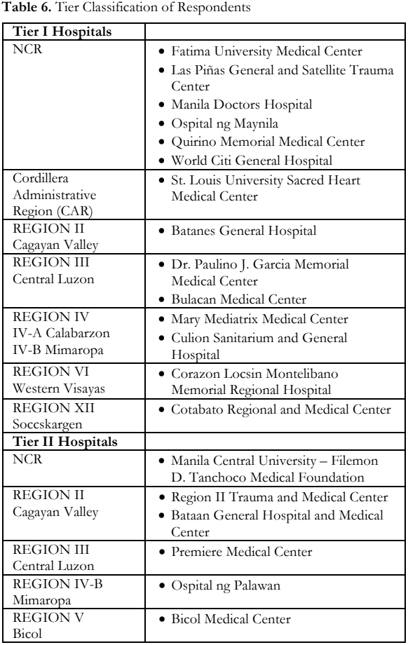 Only 8 respondents were able to fulfill all three capacities namely East Avenue Medical Center, Fatima University Medical Center, Philippine Children’s Medical Center, Rizal Medical Center, St. Luke’s Medical Center Quezon City and Global City, Southern Philippines Medical Center, and UP- Philippine General Hospital.