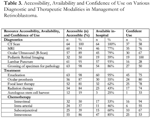 Most diagnostic and treatment modalities are available in the 64 hospitals that completed the survey. Because RB patients are often managed in referral hospitals, availability of diagnostics and treatment modalities in other institutions does not reflect utilization. There were 41 tier 3 hospitals identified, which signify availability of specialized resources. Yet, there is a low confidence in using the CT scan (56%), lumbar puncture (28%), grossing of the eye for pathology (50%), and delivering intravenous (53%) and intra-arterial chemotherapy (54%). Conversely, although 100% confidence was noted in using a pediatric retinal camera, only 19 hospitals had one. Intravenous chemotherapy, which remains to be the mainstay of treatment in most hospitals (85%), requires experienced pediatric oncologists and treatment-guided protocols to increase the confidence in managing the different stages of RB and dealing with its complications. Skills transfer for grossing of a specimen and proper reporting by a general pathologist are needed for proper tissue diagnosis. Autologous stem cell harvest had the lowest reported confidence at 33% and was only available in 3 hospitals.