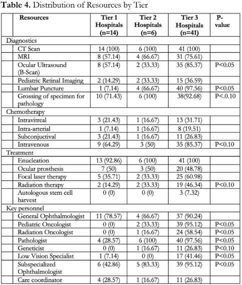 Table 4 shows the distribution of the diagnostic and treatment modalities across the different tiers. Certain resources such as the ocular ultrasound and lumbar puncture were significantly more available in the higher tiers. The availability of a pediatric oncologist, radiation oncologist, pathologist, low vision specialist and subspecialized ophthalmologist across hospital tiers showed a significant difference as well.