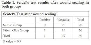The baseline IOP measurements were comparable between the two groups. All eyes in the control group were negative for leakage after sealing the corneal wounds with sutures while one out of twenty eyes in the experimental group was positive for leakage after application of the brin glue. This may be due to inadequate drying of the wound area prior to application of the glue or it could be due to insuf cient deepithelialization of the area where the glue was to be applied. Statistical analysis showed no association between the presence of leakage and method of wound sealing, indicating that sutures and brin glue have the same ef cacy in sealing wounds at intraocular pressures below baseline values.