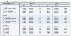Higher-order aberrations (RMS) significantly increased postoperatively in both the PlanoScan and Zyoptix groups compared with preoperative RMS values (p < 0.001). However, no significant difference in the postoperative total RMS (p = 0.257)was noted between the two groups (Table 1). An increase in postoperative wavefront error is seen as a trend in all Zernike modes, but not all proved to be statistically significant. In the PlanoScan group, there was significant increase only in the third-order coma along the x-axis (p = 0.044), quadrafoil (p = 0.003), secondary astigmatism on y-axis (p = 0.011), spherical aberration (p < 0.001), secondary coma (p = 0.043), and pentafoil (p = 0.002). In the Zyoptix group, a noticeable rise was likewise seen in the spherical aberration (p < 0.001) including third-order coma along the x-axis (p = 0.002), trefoil with base on y-axis (p = 0.008), quadrafoil (p = 0.004), se-condary astigmatism on y-axis (p = 0.020), and secondary trefoil (p = 0.046). Despite the statistically significant postoperative increase, no significant difference was noted in terms of comparing the coefficients (pre- and postoperative difference) of each Zernike mode between the two groups (p > 0.05).
