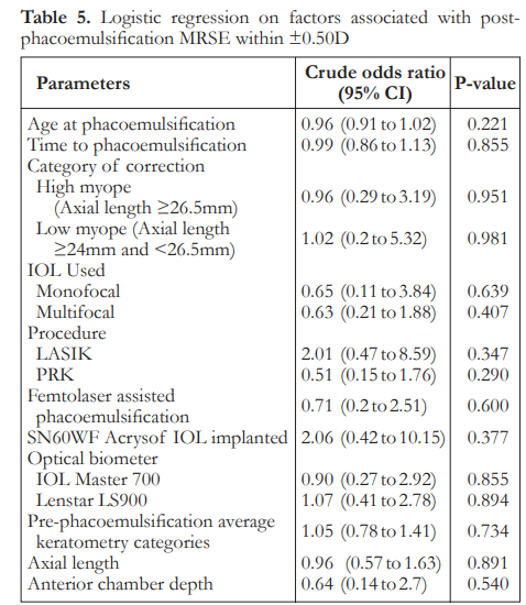 The median post-phacoemulsification MRSE was -0.06 in low myopes and -0.44 in high myopes. There was no significant difference between the two groups on refractive outcomes (Table 4). Logistic regression analysis showed that there was no significant factor associated with post-phaco MRSE within ±0.50 D (Table 5).