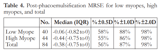 Regarding the refractive outcomes with subgroup analysis on low myopes and high myopes, overall there is a slight trend towards myopia. There is no significant difference among the three classifications regarding postoperative MRSE. Overall results show that 56% of eyes achieved refraction within 0.5 D of target refraction. These outcomes are at par with the refractive benchmarks of the NHS, however more recent studies recommending a benchmark level of 80% of eyes within 0.5 D have still not been achieved.17 Logistic regression analysis for factors associated with post-phacoemulsification MRSE within 0.5 D showed there were no statistically significant correlations noted. This suggests that by looking at preoperative clinical characteristics, predicting which patients will achieve refractive outcomes within 0.5 D postoperatively may be highly unpredictable. This has to be addressed by proper preoperative counseling and management of expectations. This is relevant as there is an increasing trend of earlier phacoemulsification for post corneal refractive surgery eyes despite good vision or even 20/20 corrected distance visual acuity (CDVA).18 This may be because of intolerance of even mild visual disturbances from a faint cataract, desire for spectacle independence, or difficulty with lenticular myopic shift. This subset of patients and post-corneal refractive surgery patients, in general, tend to be very discriminating as they are used to a high level of vision. There are also theories on how corneal refractive surgery itself may induce cataract formation due to a combination of acoustic and photo-oxidative stress, which further emphasizes the need to have a reliable method for IOL power calculation in these eyes.19, 20
