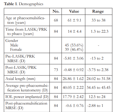 Eighty-four (84) eyes of 68 patients were included in the study. Mean age at time of phacoemulsification was 61 ± 9.1 years, while mean interval from corneal refractive surgery to phacoemulsification was 14 ± 4.4 years. Seventy-three (73) eyes had pre- and post-LASIK/PRK manifest refraction available (Table 1).