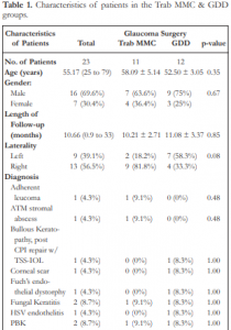 was no association between any of the diagnoses and causes and the type of glaucoma surgery (Table 1). Eleven patients (8 Trab MMC and 3 GDD)