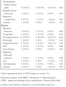 Out of the 222 medical records reviewed, 23 patients, mean age of 55.17 years (range, 25 to 79), were included in the study. Of these, 11 (47.8%) had Trab MMC and 12 (52.2%) GDD implantation. There were 16 males (7 Trab MMC and 9 GDD) and 7 females (4 Trab MMC and 3 GDD). There was no significant association between gender and the glaucoma surgery performed (Table 1). The mean age of patients who had Trab MMC (58.09 ± 5.14) and GDD (52.50 ± 3.05) was not different (Table 1). The mean follow up was 10.66 months. There was no difference in the length of follow up between the two surgeries (Table 1). There were 13 right and 9 left eyes that had the glaucoma surgeries. There was no significant association between laterality and the type of surgery (Table 1). The most common diagnosis was pseudophakic bullous keratopathy in both surgeries (39.1%) and the most common cause was decompensation (47.8%), followed by fungal infection (13%). There