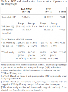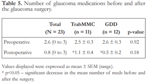 There were no differences in the pre- and post-surgery visual acuities of patients in the Trab MMC (p = 0.08) and GDD (p = 1.00) groups. There was also no difference (p = 0.43) in the postsurgical visual acuities of patients between the 2 groups. There were no differences in the mean number of glaucoma medications between the 2 groups before (p = 0.92) and after (p=0.18) glaucoma surgery. Both groups (Trab MMC: p = 0.02; GDD: p<0.001) had significantly reduced number of medications after the surgery (Table 5). All were on one topical medication postoperatively, controlled usually with an aqueous suppressant (timolol).