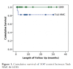 Three primary outcomes were evaluated: graft status, postoperative IOP, and visual acuity (VA). Controlled IOP with and without medication was defined as IOP greater than 6 but less than 20. Summary of quantitative data (e.g., age, followup period, number of glaucoma medications, and IOP) were expressed in mean, standard error (SEM), and range. Visual acuity was expressed in median and interquartile range (IQR), while categorical data (gender, laterality, diagnosis, causes, graft status, number of patients with controlled IOP) were expressed in counts and percentages. Student’s ttest and Mann-Whitney test determined if there were differences in the mean and median results, respectively, between Trab MMC and GDD. Paired t-test determined if there were differences in the mean IOP control and number of medicines taken before and after the surgery. Wilcoxon Signed Rank test determined if there was a difference in the visual acuity before and after the surgery. McNemar’s and Fisher’s exact tests compared the percentages and Kaplan-Meier survival analyses compared the surgeries and their effects on IOP control and graft failure. All the statistical tests were performed using