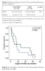 Only one patient (treated with GDD) had graft failure that occurred after 7.7 months. Using Log Rank test [χ2 (df = 1) = 0.196, p = 0.66], there was no difference in the survival distribution of the corneal graft between the 2 surgeries (Table 6, Figure 2). There were also no postoperative complications for both the PKP and the glaucoma surgeries.