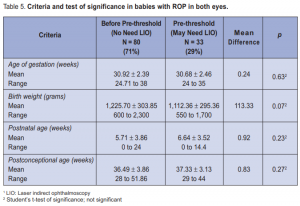 higher (p < 0.05) in babies found to have ROP in both eyes compared to those with IR (Table 4). This suggested that conducting the initial retinal exam at a mean PNA of 3.88 weeks would allow monitoring of fundus changes starting at IR. There were no significant differences (p > 0.05) between the criteria for babies who were assessed to be in no imminent need for LIO and those with pre-threshold ROP who may need LIO (Table 5). This implied that AOG, BW, PNA, and PCA alone were not sufficient to predict the onset of ROP fundus changes that may need LIO at a future time. The data suggested that the initial retinal exam should be conducted at PNA earlier than 6.64 weeks or at PCA less than 37.33 weeks to catch the earlier stages