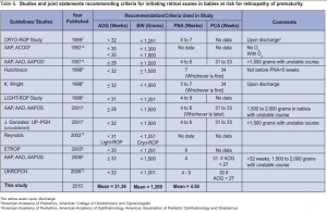 screening criteria for ROP using the data from the CRYOROP and LIGHT-ROP studies. He noted a “time window” for the development of serious ROP at PCA range of 30.9 to 46.3 weeks and PNA range of 4.7 to 18.7 weeks . Our study found a PCA range of 29 to 44 weeks and PNA of 0 to 14.4 weeks in babies with pre-threshold “time window” through which the beginning of serious ROP could be detected. Table 6 presented a tabulation of the criteria recommended as guidelines for screening babies at risk for ROP and the means of this study. The changes through the years were evident. The data suggested that the mean AOG and BW of this study were within the criteria recommended by Gonzales et al. (2001: unpublished data) and those recommended by the joint statements of the AAO, AAP, AAPOS (2006)6 and the UKRCPCH (2008).12 The PNA range of 3.88 to 5.71 weeks between babies found to have IR (Table 4) and babies who were assessed to be in the earlier stages of ROP (Table 5) implied that the initial retina exam should be done between PNA of 4 to 6 weeks in order to intercept ROP at a time before laser treatment was needed or before more serious ROP was present. In summary, the means of this study were within the criteria used by Gonzales et al. which were in agreement with the joint statements of the AAP, AAP, AAPOS (2006)6 as well as with UKRCPCH(2008).12 Thus, babies born with AOG <32 weeks and birth weight <1,500 grams or babies born >32 weeks or >1,500 grams with “stormy” perinatal courses6,12 would need initial retinal exams by PNA of 4 weeks.