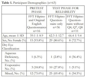 The review committee compared the BT version and the source questionnaire and further edited the FT instrument to produce a final forward Filipino translation. The FFT was tested on dry eye patients, and the results of which were analyzed for internal consistency.