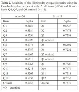 Table 2. Reliability of the Filipino dry eye questionnaire using the Cronbach alpha coefficient with: A. all items (n=36) and B. with items Q4, Q7, and Q8 omitted (n=11).