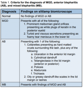 Consecutive patients who consulted at the General Clinic and the External Disease Clinic of a tertiary public hospital over a period of 3 months with the diagnosis of meibomian-gland dysfunction (MGD), anterior blepharitis (AB), or mixed blepharitis (MB) were recruited into the study. One of the authors (ABDV) established the diagnosis based on preset criteria of clinical findings (Table 1) using a single slit lamp biomicroscope (Topcon Slitlamp SLD7, Japan).