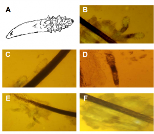 were applied to the blood agar plates. Specimen from the right eye Figure 1. Appearance of Demodex folliculorum under the light microscope. The diagnosis of Demodex infestation is made by identification of the parasite under light microscopy. Diagram of a typical parasite that is cigar-shaped and has 4 pairs of short legs on the right half and a mouth with a biting apparatus on the extreme right (A). The parasite frequently appears in pairs and has an obvious head-neck part and body-tail part (B). The parasite is covered by a cuticle surface, and the body is mostly semi-transparent (C). The body-tail part may show numerous striations, while the head-neck part contain 4 pairs of short legs (D). Demodex follicullorum in clusters in a single hair follicle (E). Demodex embedded in dandruff-like debris (F). was applied in the form of “R” and that of the left eye in the form of “L”. Each plate was labeled with the patient’s name and date of collection and sent to the Microbiology Department of UP-PGH for incubation and identification. All patients were referred back to either the General Clinic or the External Disease Clinic for further treatment and follow-up. The main outcome measures were:
