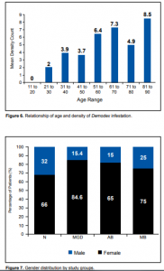 These results showed possible direct relationship between age and incidence of Demodex infestation and between age and density of Demodex. Relationship with sex