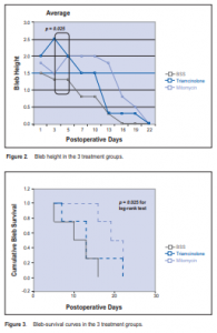 compared to the BSS group in a rapidly healing rabbit model. Blebs treated with MMC had longer survival mean time of 19.8 days, 5 days longer than the triamcinolonetreated group, showing that MMC prolongs bleb survival. This is consistent with findings in other studies demonstrating that MMC is an antifibrotic agent.13-14 Total days of survival were not statistically different across the three groups (p = 0.08) but the trend was there. The baseline characteristics of the 3 groups were similar, with similar reduction in IOP and bleb height on the first postoperative day. However, the mean IOP 1 week postoperatively was lower for the TA group than the BSS group, especially on the third postoperative day, indicating that triamcinolone somehow modulated the woundhealing response. The MMC-treated group generally had a lower IOP compared with the BSS group. IOP reduction by MMC was seen beyond the 10th postoperative day, indicating stronger antifibrotic effects than TA. No significant difference was seen in bleb height among the groups, except on postoperative day 2 when triamcinolone had significantly higher bleb than the other 2 groups. This implied that triamcinolone may delay or modify wound healing in the early postoperative period but was not strong enough to sustain the effect. Mean fibroblast counts for the 3 treatments groups were not statistically different at the time of bleb failure. Bleb survival was longest with MMC, followed by triamcinolone. Survival analysis showed that 50% of triamcinolone-treated blebs survived by the 10th postoperative day compared with BSS, and 50% of MMCtreated bleb survived by the 20th postoperative day compared with triamcinolone, indicating that triamcinolone was intermediate compared with MMC and BSS, and that its antifibrotic effect was much less than that of MMC. In the triamcinolone group, 1 bleb failed by day 7 and 2 blebs failed by day 13. Only a few drugs have been used clinically to influence or modify the wound-healing process following filtering surgery. Corticosteroids applied in the early postoperative period have an antifibroblastic potential and their effectiveness has been shown in clinical studies.15 Topical steroids are commonly used to decrease ocular inflammation to avoid related complications such as significant iritis and choroidal detachment, especially in the immediate postoperative period. Direct application of an antimetabolite or antifibrotic agent intraoperatively has advantages over postoperative applications. These include delivery to the tissues at the very start of the scarring process, direct delivery to the desired tissues at higher concentrations, and the minimization of the exposure t Othe drug of other tissues such as the corneal epithelium.12 To be more effective at modulating the wound healing, the steroid is better given subconjunctivally as a depot so that continuous drug delivery to the site is assured. In summary, a single, 4-mg dose of triamcinolone