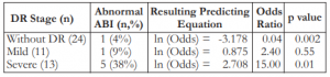 Our data showed that patients with no diabetic retinopathy have lesser probability of having an abnormal ABI score (p = 0.002). The odds ratio of 0.04 meant that patients diagnosed with diabetic retinopathy were (inverted odds) 23.8 times more likely to have an abnormal ABI score than those who have no diabetic retinopathy. On the other hand, severe diabetic retinopathy has a significant relationship with ABI score (p = 0.01), where patients were 15.0 times more likely to have an abnormal ABI score than those who have milder forms of diabetic retinopathy. The presence of mild diabetic retinopathy has a smaller effect (p = 0.55) on the occurrence of an abnormal ABI score, where the likelihood was 2.4 times as compared to the no diabetic retinopathy group (Table 2).