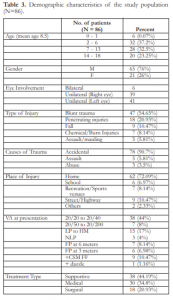 7. Noorani S, Ahmed J, Shaikh A, et al. Frequency of different types of pediatric ocular trauma attending a tertiary care pediatric ophthalmology department. Pak J Med Sci 2010;26:567-570.