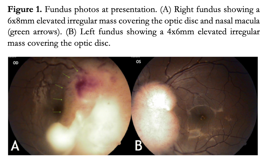 Best-corrected visual acuity was 20/125 OD and 20/25 OS. Gross external eye, pupillary responses to light, intraocular pressures, anterior segment examination, color vision test, and Hertel’s exophthalmometry were all within normal limits. Dilated funduscopy of both eyes revealed an irregular, poorly circumscribed, white elevated mass with overlying telangiectatic vessels emanating from the optic disc and extending to adjacent areas of the retina. The mass measures approximately 6x8mm OD and 4x6mm OS in greatest horizontal and vertical diameters, respectively. Additional findings of focal venular tortuosity and superficial hemorrhages were noted (Figure 1).