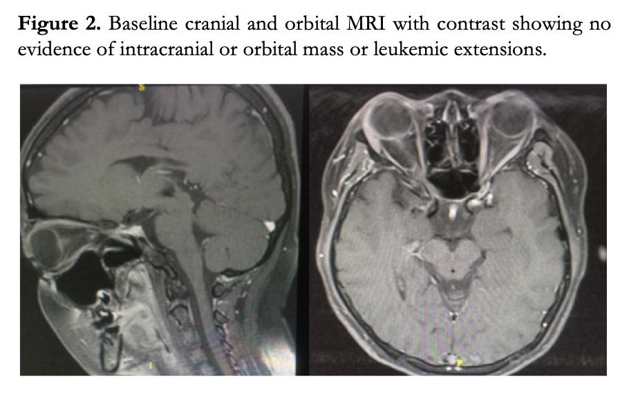 Magnetic resonance imaging (MRI) of the brain and orbit showed no other abnormalities or evidence of infiltration elsewhere (Figure 2). Cytologic analysis of the cerebrospinal fluid did not show any abnormal cells or blasts.