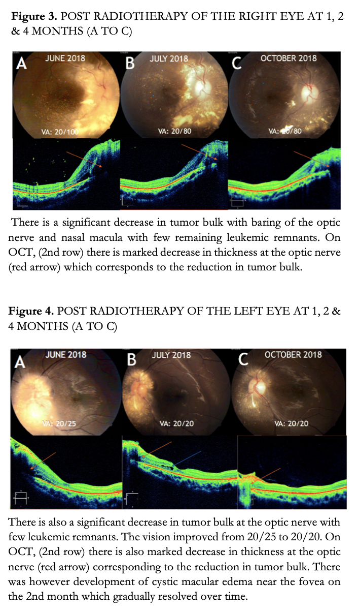 In summary, leukemic optic nerve infiltration represents a visual emergency. It is prudent that children with acute leukemia who present with ocular complaints should have an immediate ophthalmological assessment. Radiotherapy is a safe, well tolerated, and effective treatment modality and should be instituted before irreversible optic nerve damage occurs. Long-term side effects and the possibility of relapse should always be considered. A multidisciplinary team approach involving the oncologist, ophthalmologist, and hematologist are all essential for the successful management of ALL and its complications.
