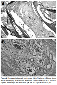 Histological examination of the implants revealed the presence of fibrovascular tissues in all (Figures 2 and 3). Growth of the fibrovascular tissue was confined mostly to the outer third of the implants; none was seen in the middle two-thirds. Two of the six implants were invested with a thin fibrous capsule (Figure 4). Minimal inflammatory cells were present. A few plasma cells were scattered in the center of the bone implants, mixed with numerous red blood cells (Figure 5). More plasma cells were observed in the bone implant margins. Granulomatous reaction was absent.