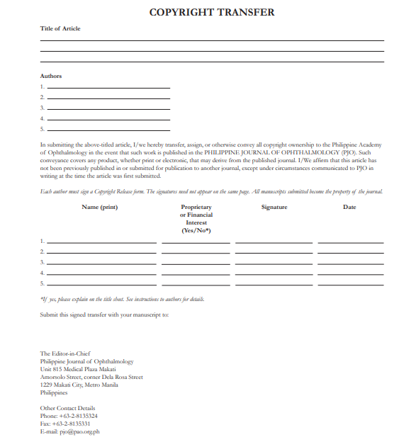 Consideration of manuscripts for publication in the PHILIPPINE JOURNAL OF OPHTHALMOLOGY is dependent on the assurance that the material (in whole or part) is not under consideration by another journal, is not in press in any other format, and has not been previously published. Each author must sign a statement transferring copyright ownership to the Philippine Academy of Ophthalmology. Manuscripts which have been accepted for publication may be published in another journal after securing a written consent from the editor in chief of the PHILIPPINE JOURNAL OF OPHTHALMOLOGY.