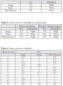 for stage and poor reliability for zone of ROP. Both also scored high in diagnosing plus disease within each group. However, when compared across the groups, there was difference in reliability due to differences in interpretation of plus disease.