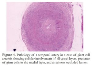 Figure 4. Pathology of a temporal artery in a case of giant cell arteritis showing cellular involvement of all vessel layers, presence of giant cells in the medial layer, and an almost occluded lumen.